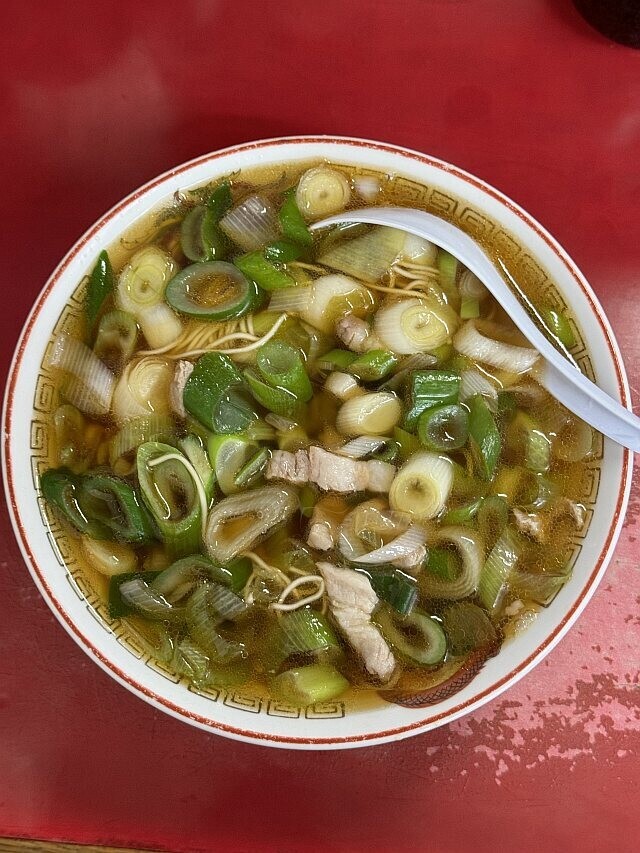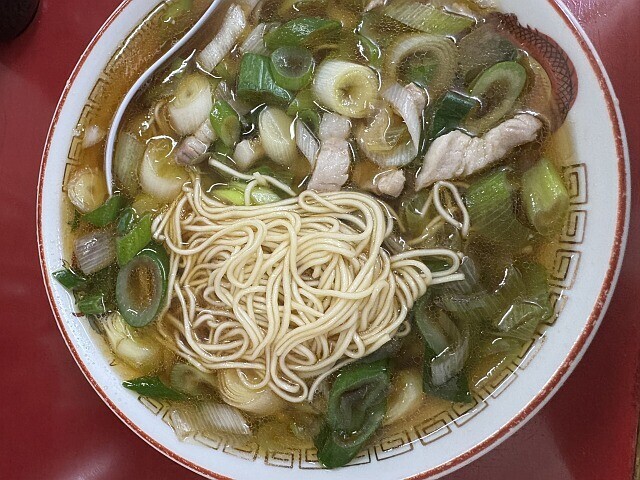 ネギがどっさり入っていて、チャーシューではなく豚のばら肉がトッピングされている。