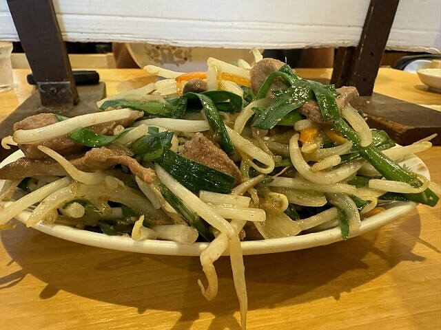 具材はレバ、ニラ、もやし、タマネギ、ニンジン。
