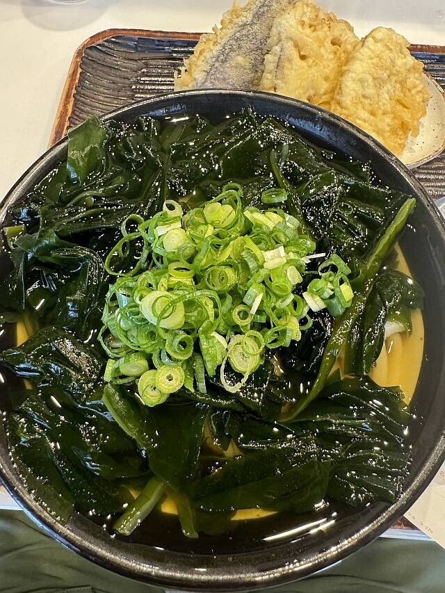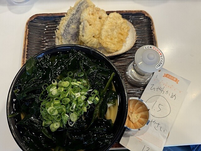 さて、今回はといいつつ、定番の「天然わかめうどん」の冷かけに「野菜天盛」をつけて。