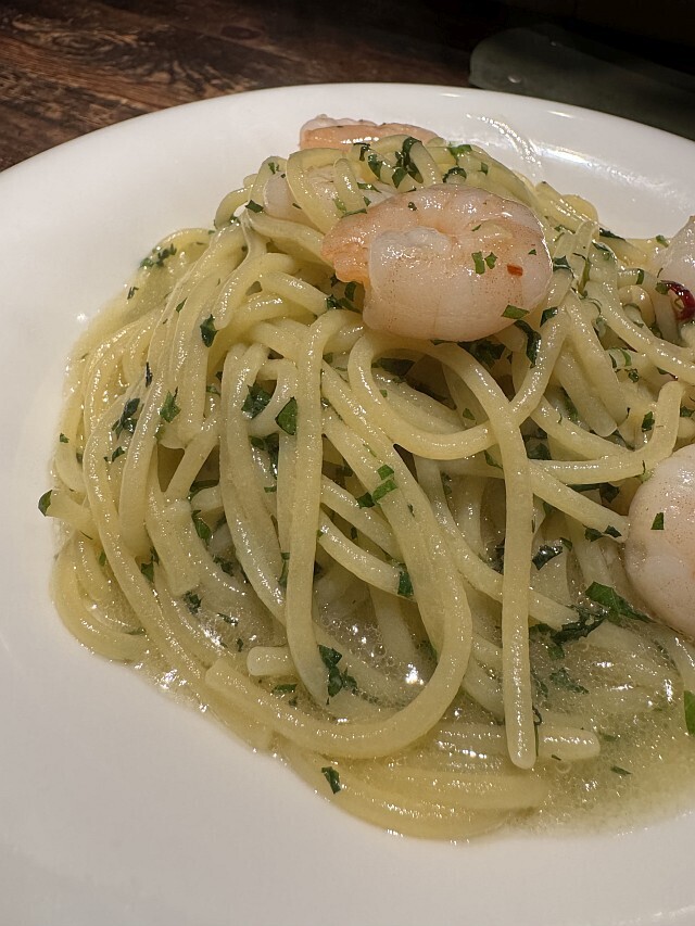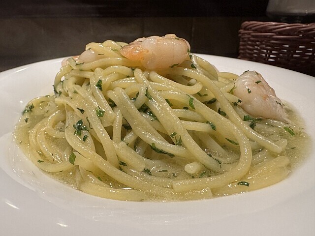 オリーブオイルベースのパスタの上には、ぷりぷりの海老。