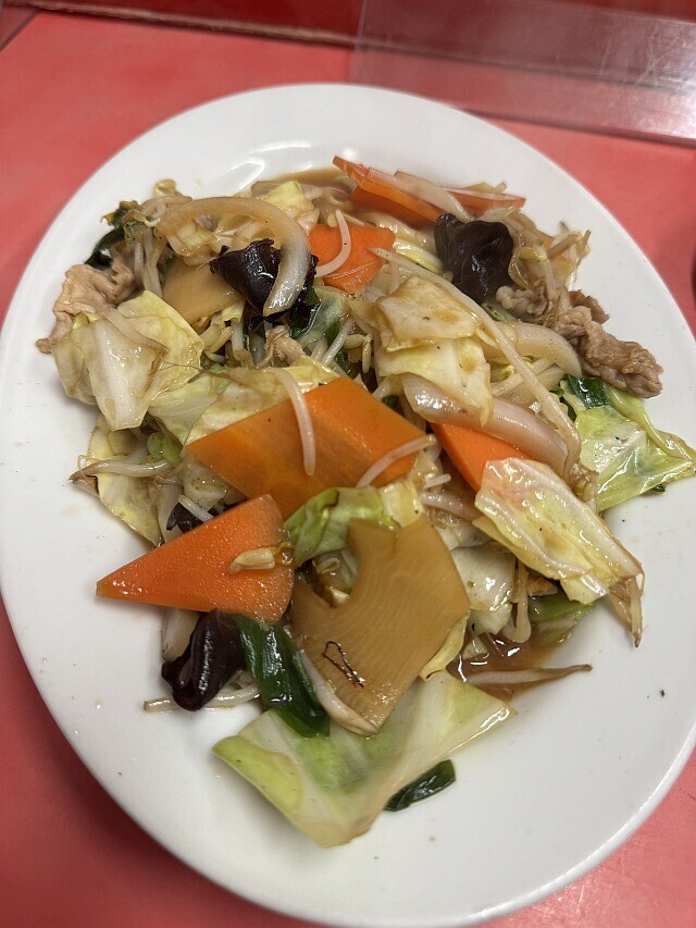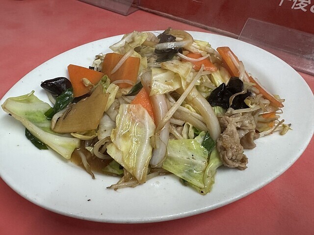 野菜炒めは、豚肉、キャベツ、もやし、タマネギ、ニンジン、タケノコ、ニラ少々、きくらげという中身。